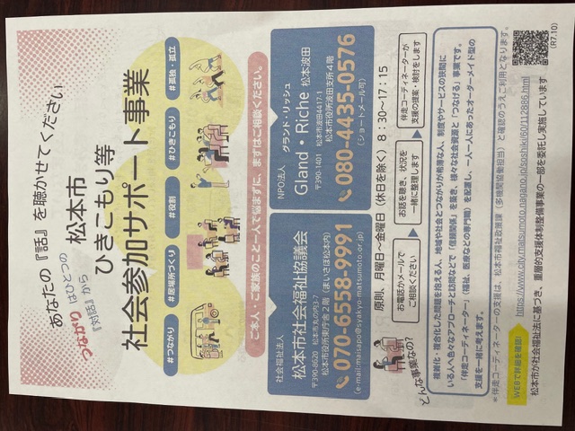 今年もお世話になりました。 あっという間に年の瀬ですね。 今年10月から、松本市波田支所四階に、ひきこもり支援の相談場所ができました。 詳しくは若者支援の案内ページチラシをご覧ください。 お困り事などございましたら、ご相談くださいね。 担当者直通電話番号:080-4435-0576 こちらは職員研修の様子です。 今年は法定研修以外にも、初心に戻りアセスメントの取り方等たくさんの自主研修を行いました。 グループホームシエスタには、先日、フリマネット信州さんから寄付していただいたクリスマスツリーを飾りました☆ 来年もよろしく願い申し上げます!