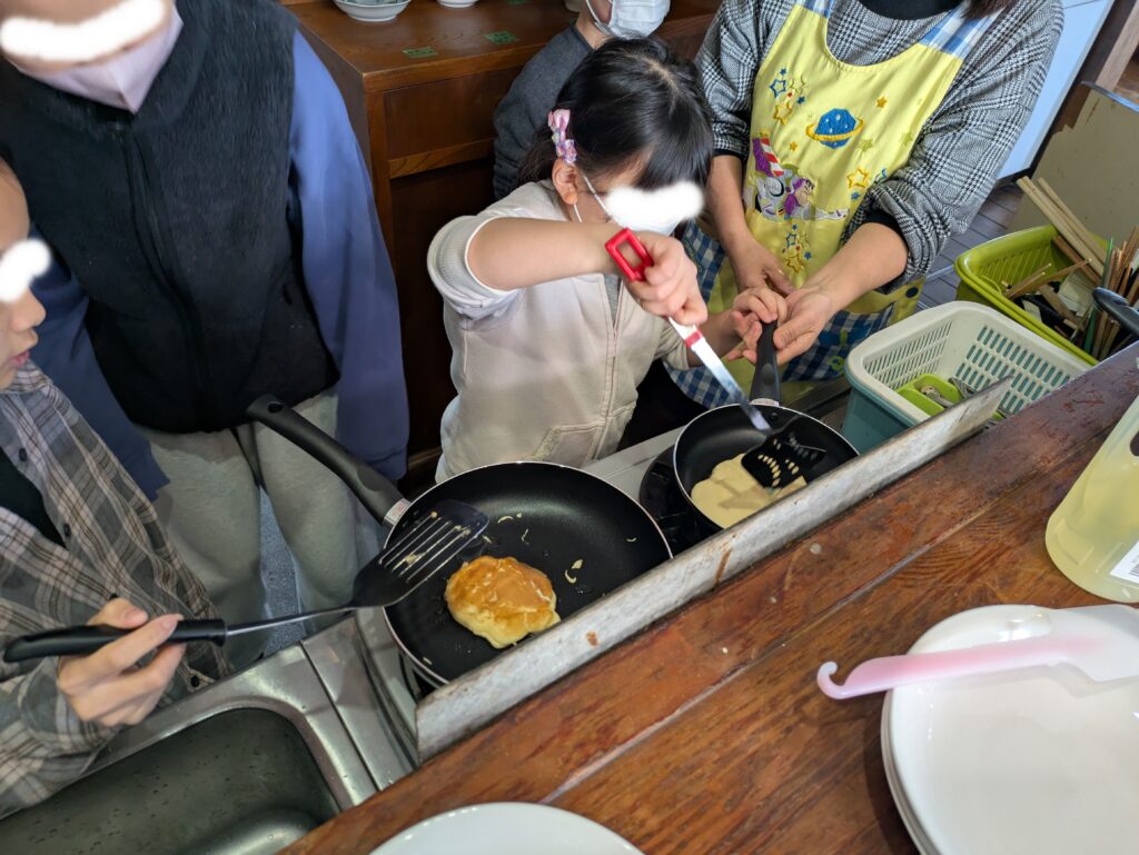フライパンに生地を流して、じっ…と待つこと数分。 「そろそろかな?」「ひっくり返す!」 フライ返しを持った手が、ちょっと震えながらも見事にパンケーキをくるり!🎊 きれいなきつね色に仕上がって、みんな思わずニッコリ😊
